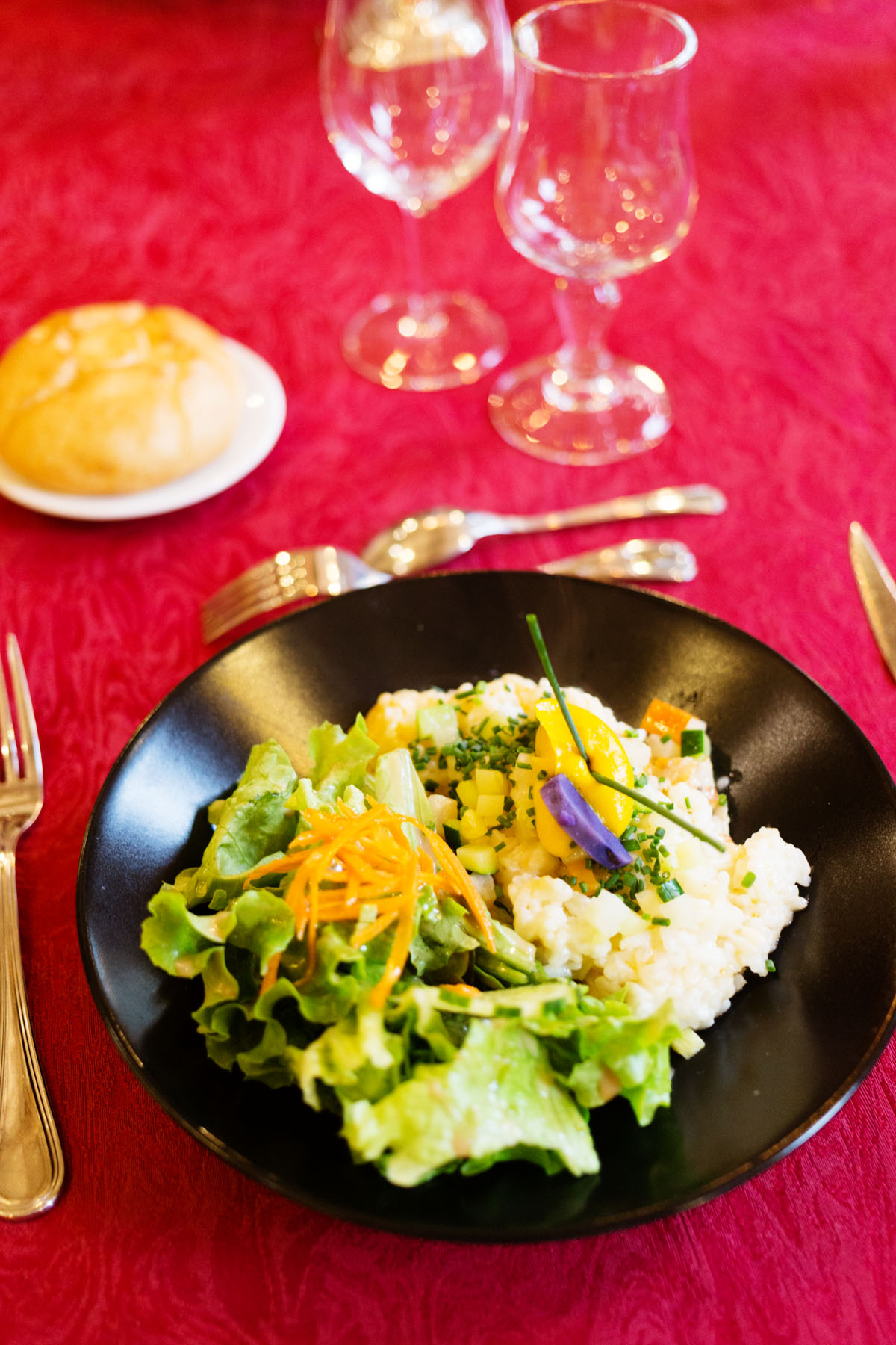 Superbement installés, nous avons savouré un très bon déjeuner de saison – et une attention particulière a été apportée pour mon intolérance au gluten, donc le Chef y est sensibilisé et vigilent.