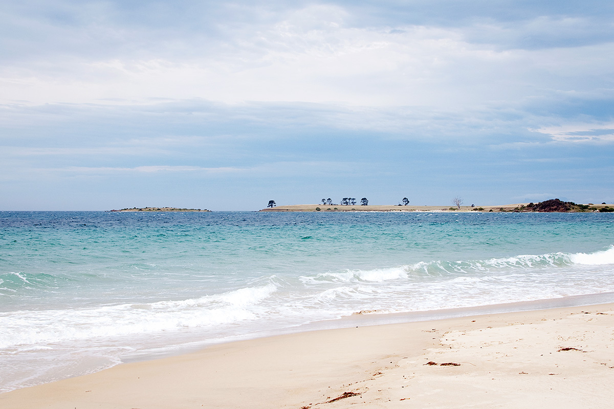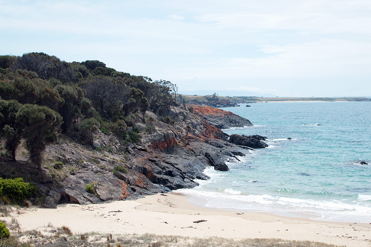 Voici ci-dessous le premier paysage sur lequel nous sommes tombés en arrivant en Tasmanie, après à peine une quinzaine de kilomètres au compteur – cette plage proche de Rocky Hills :