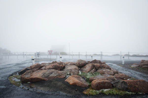 Euh comment dire ? A 18h je ne pense pas que toute cette brume ambiante parte très loin pour me laisser voir ce graal – le point de vue magique sur Hobart ! J’ajoute à cela, un vent terrible, un froid de canard et… et… tenez vous bien de la neige ! En plein été en Tasmanie ! Oui messieurs-dames !