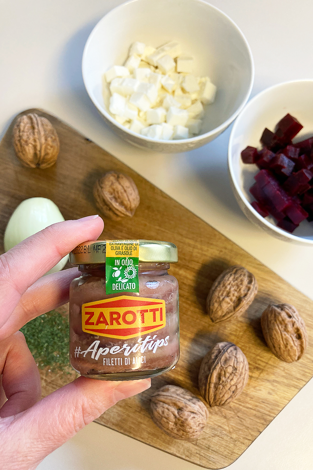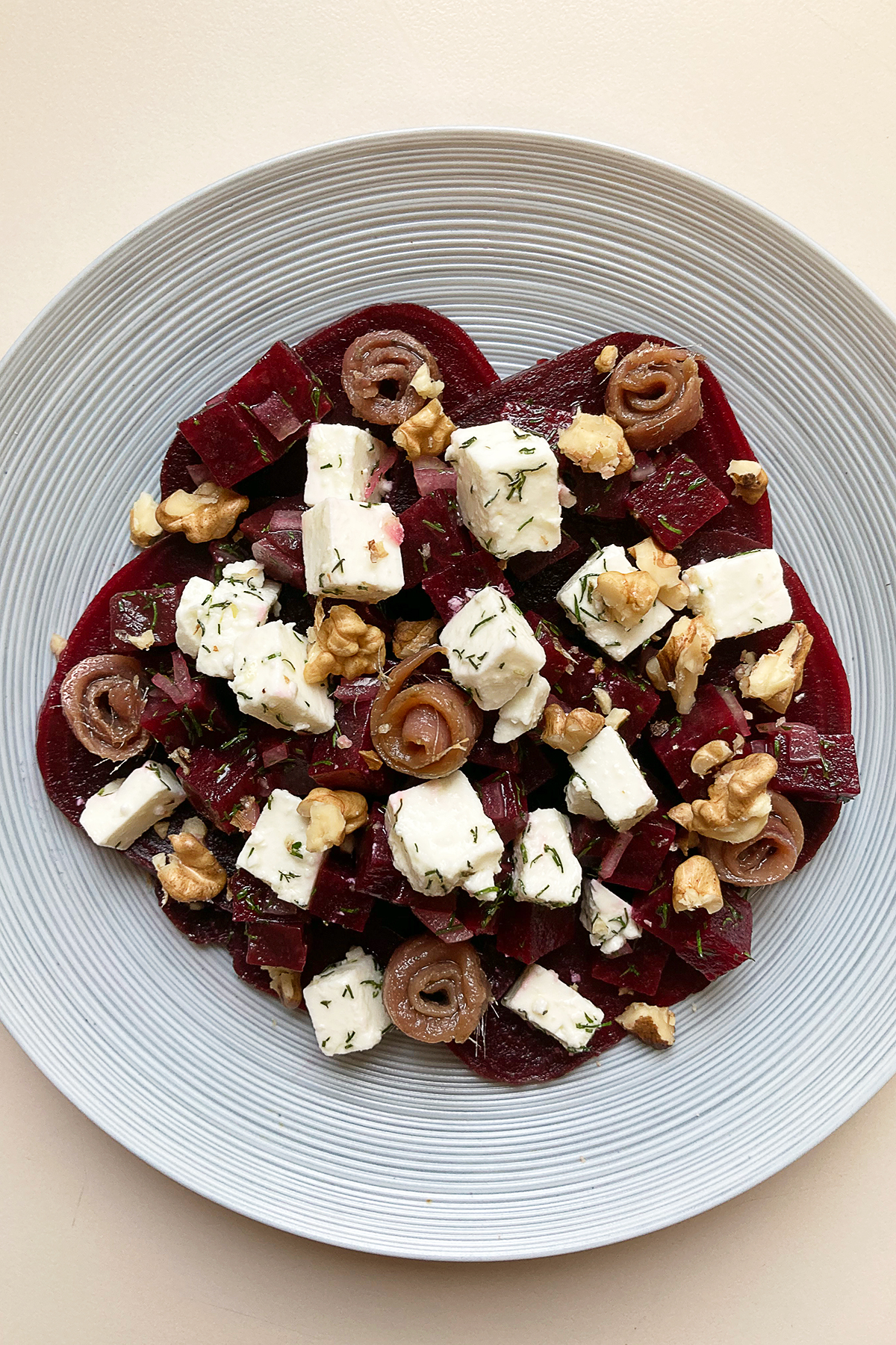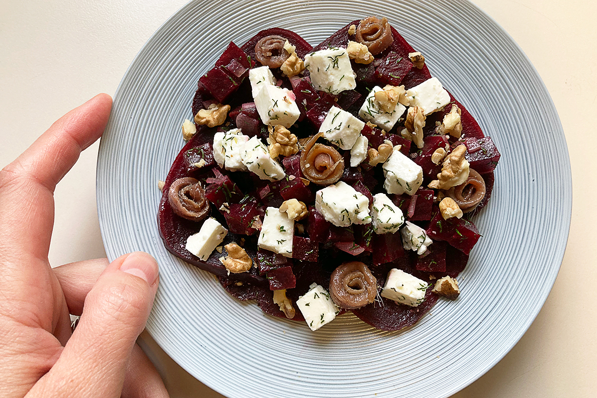 – Déposez des rondelles de betteraves sur le fond de l’assiette, puis les betteraves en cubes, parsemez la feta, puis les noix et enfin déposez les rouleaux d’anchois