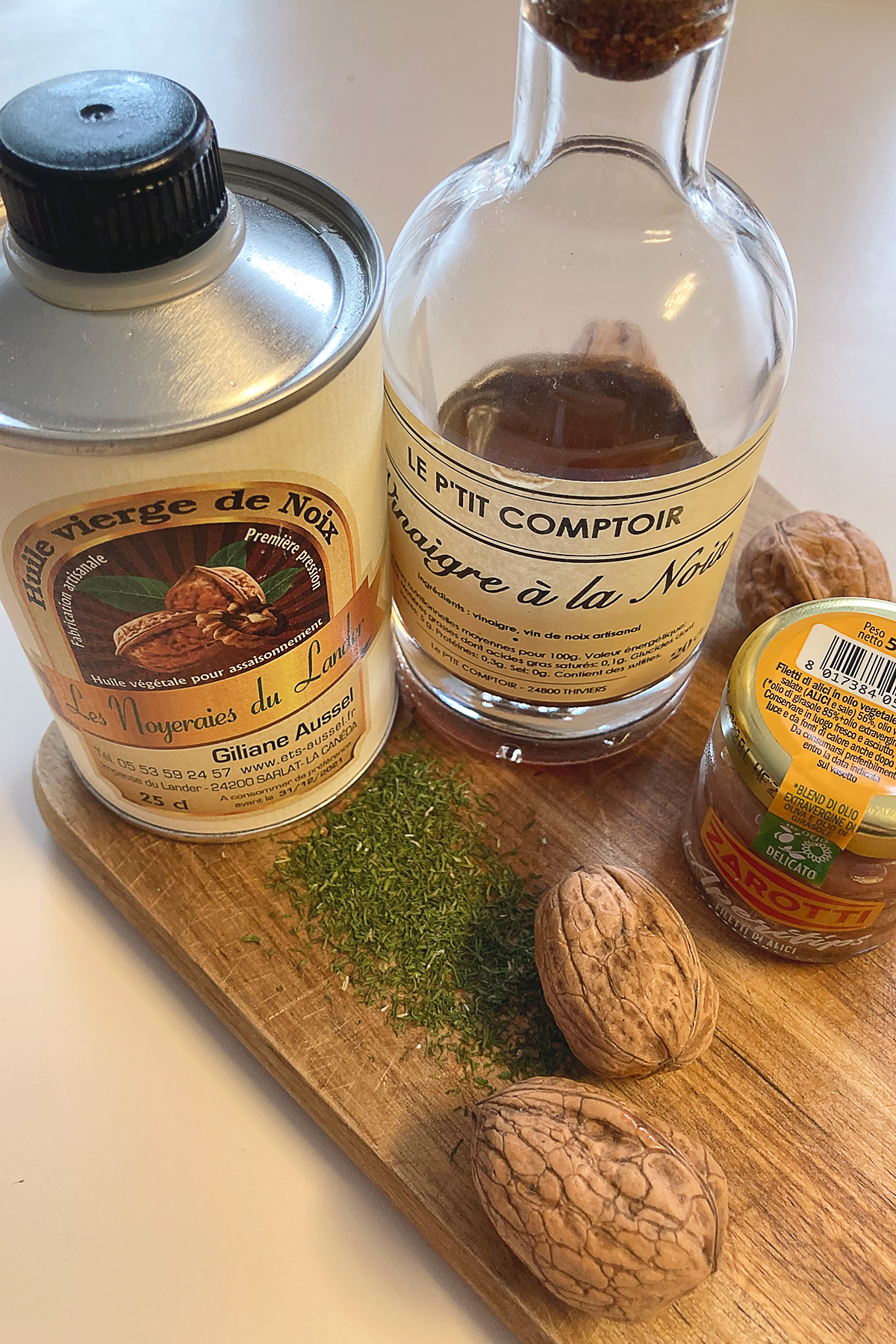 – Versez un filet d’huile et de vinaigre (j’ai utilisé à la noix), salez et poivrez
