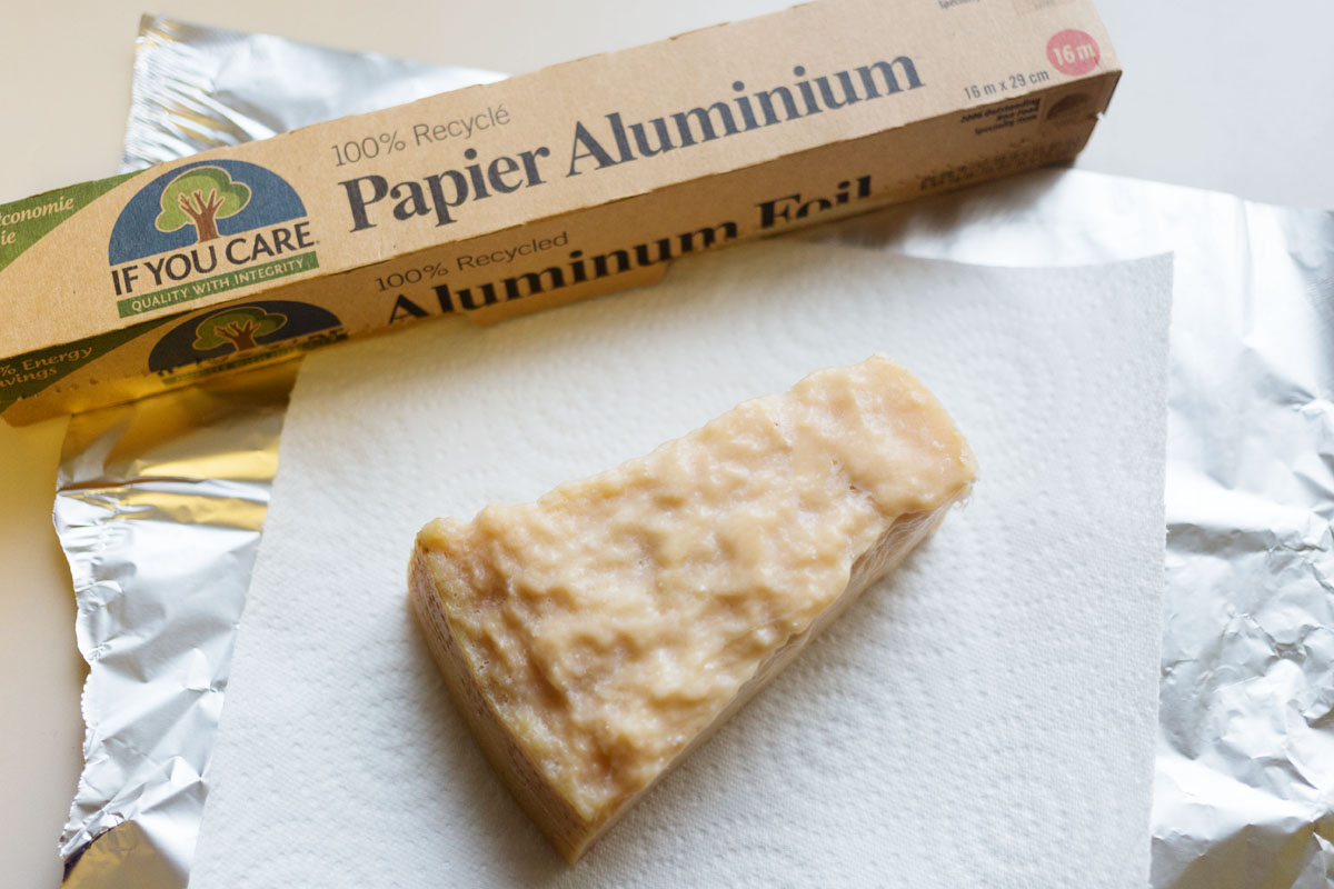 Astuce : pour conserver votre Parmigiano Reggiano AOP, retirez l’emballage, et poser le sur une feuille de papier absorbant + une feuille d’aluminium et bien le fermer hermétiquement, puis le déposer dans le bas à légumes du bas du frigo – se conserve plusieurs mois.