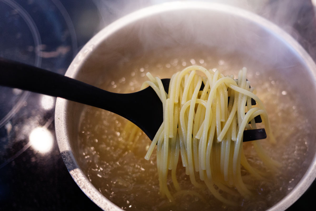 – Faire cuire les spaghettis dans un grand volume d’eau salée, puis égouter