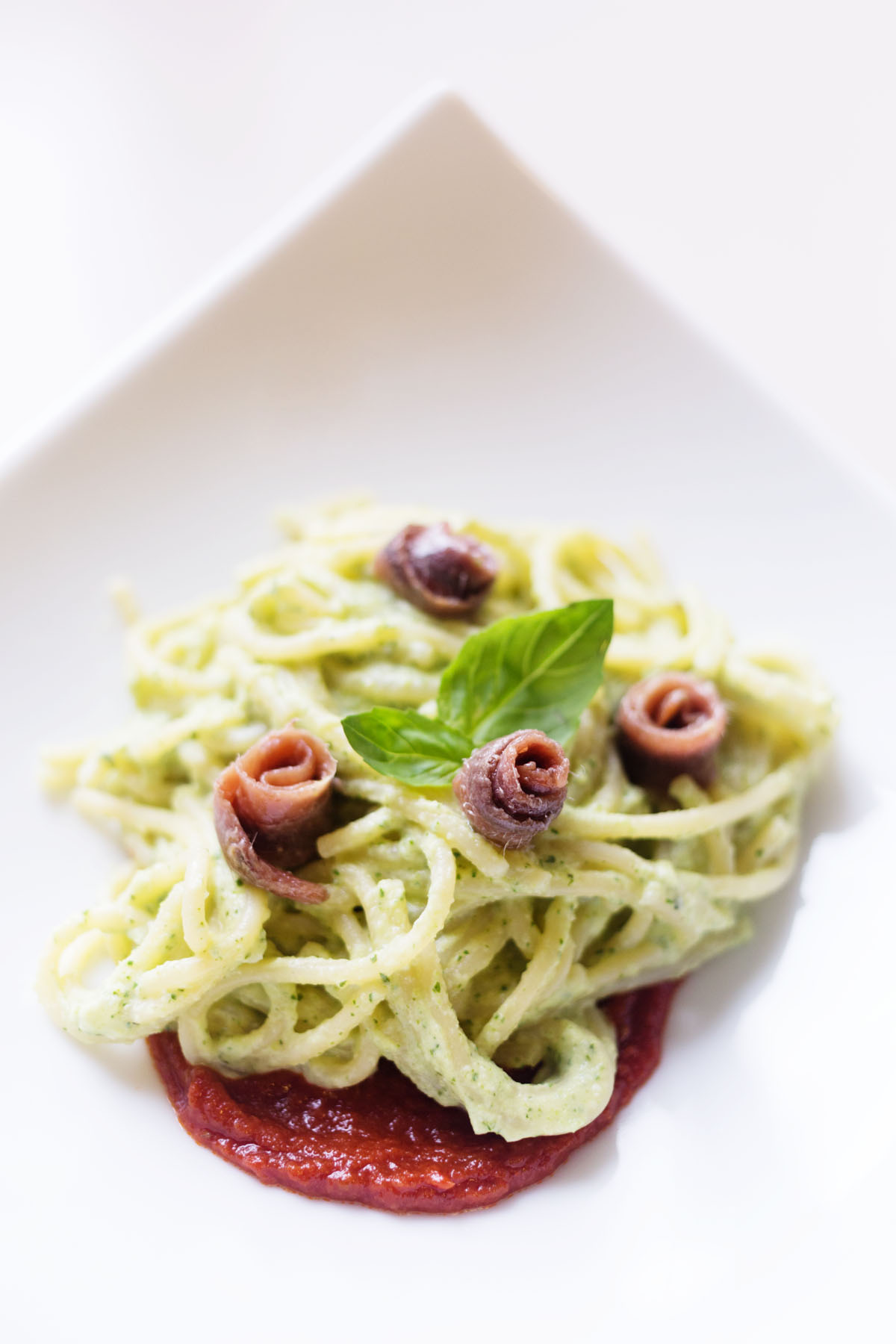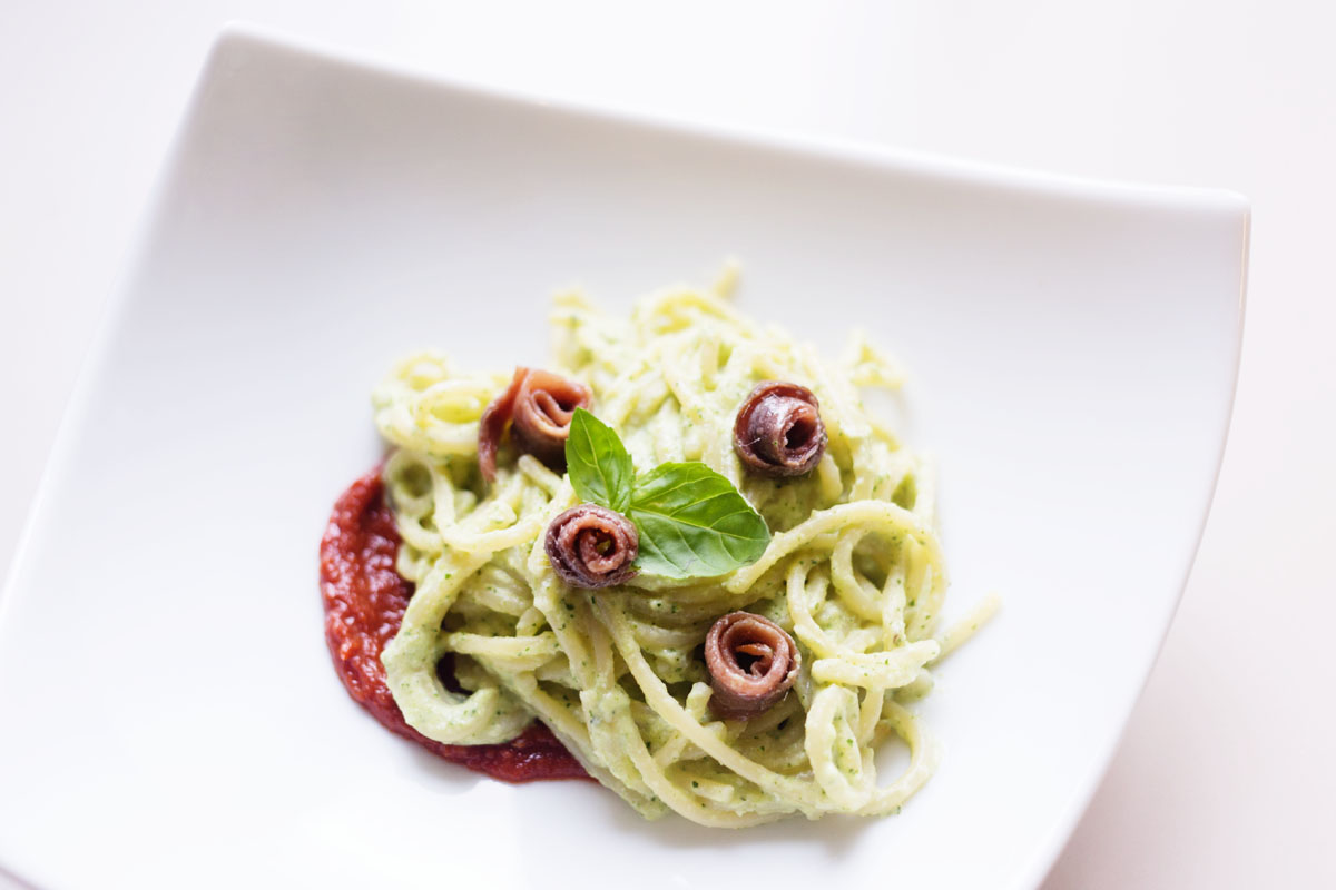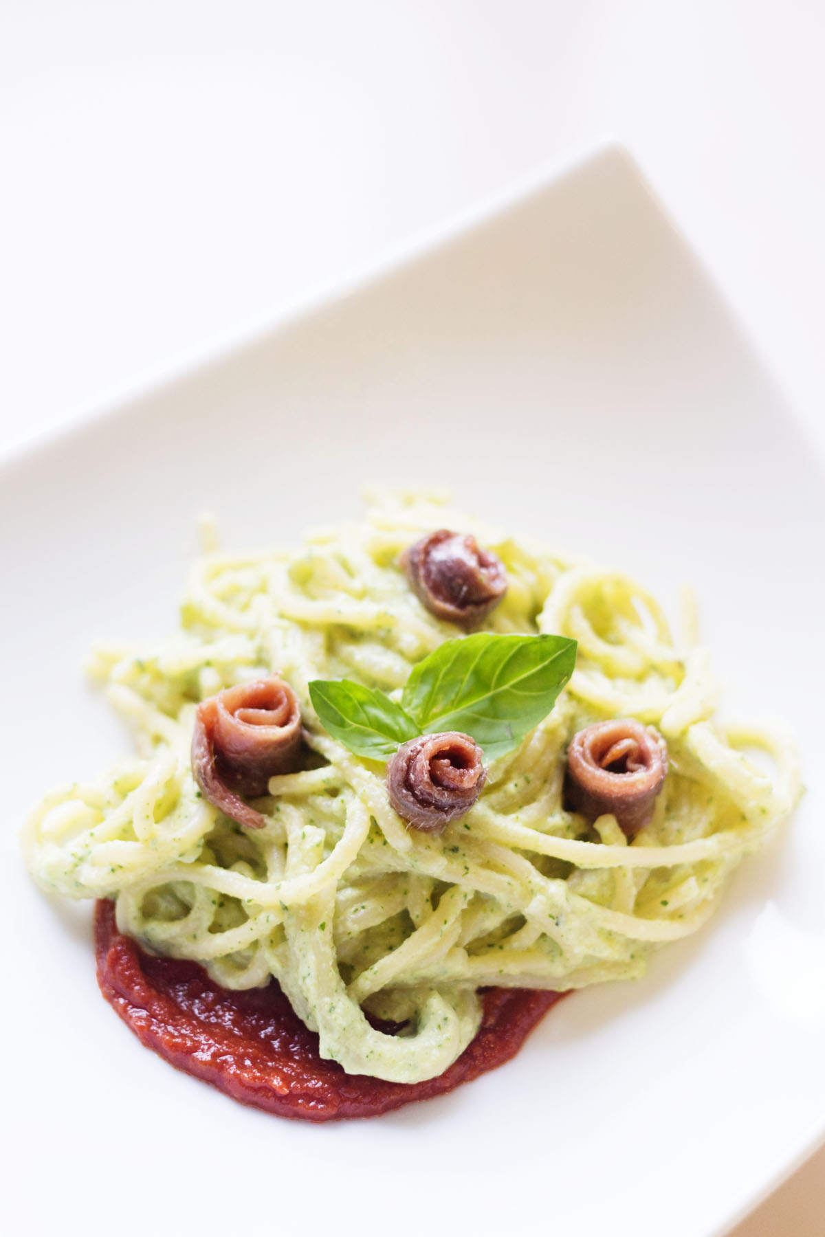 Plat – Spaghettis à la crème de courgettes, sauce piquante aux anchois