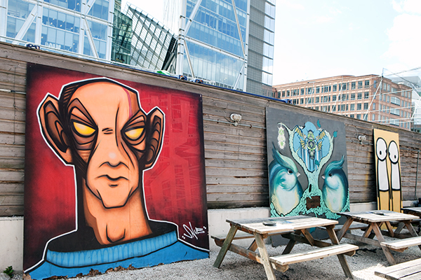 Il s’agit du LIGHT sur Norton Folgate (Liverpoll Street), un lieu assez mythique où j’ai trouvé une terrasse entourée de grands panneaux peints par des artistes graffiti, alors forcément mon oeil a fait « tilt » et s’est dirigé vers le bar et le restaurant… énorme lieu, très industriel, super bar MAIS le personnel ne semblait pas vouloir travailler ! J’ai attendu bien 10 minutes devant le comptoir en regardant le serveur qui rangeait ses verres, sans vouloir servir, puis je suis allé côté restau, the same! Donc je suis partie voir ailleurs 🙂