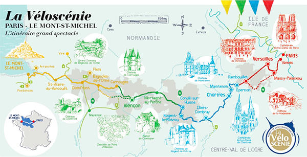 La Véloscénie traverse en effet 8 départements (Paris, Haut-de-Seine, Essonne, Yvelines, Eure-et-Loir, Orne, mayenne et Manche répartis sur 4 régions au Sud-Ouest de Paris dont l’Île-de-France, le Centre-Val de Loire, le Pays de la Loire et la Normandie.En tout 450km de pistes cyclables en voie partagée ou voie verte qui passent aussi à travers 3 parcs naturels régionaux (Haute Vallée de Chevreuse, Perche et Normandie-Maine).