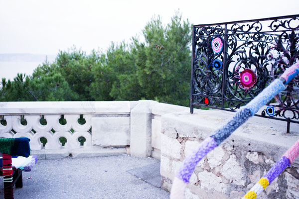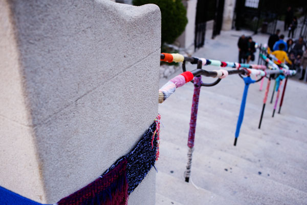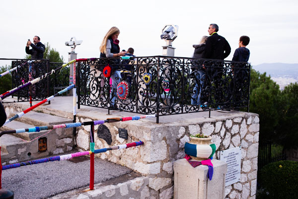 Une fois au sommet, j’ai d’ailleurs remarqué qu’un groupe de ‘ street art tricot’ était passé par là puisque de nombreux poteaux, bancs, balustrades, … étaient recouverts de tricots colorés, sans doute pour pouvoir affronter l’hiver plus sereinement.