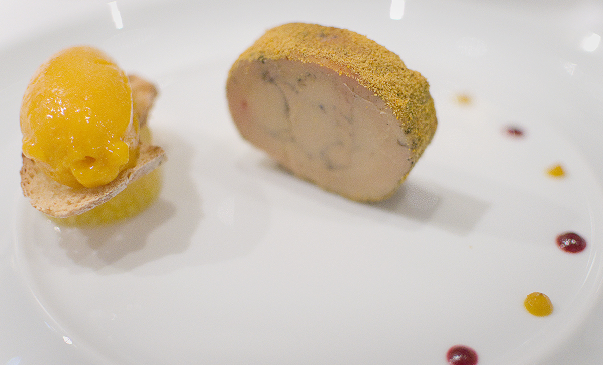 Tourain revisité – Foie gras de canard IGP mi-cuit au torchon, poudre d’orange et glace Mangue/Galanga