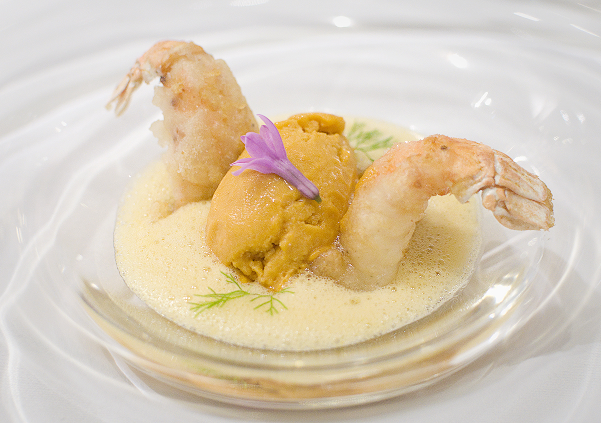Langoustine de Loctudy, en tempura, citronnelle, ananas et glace tomato/curry