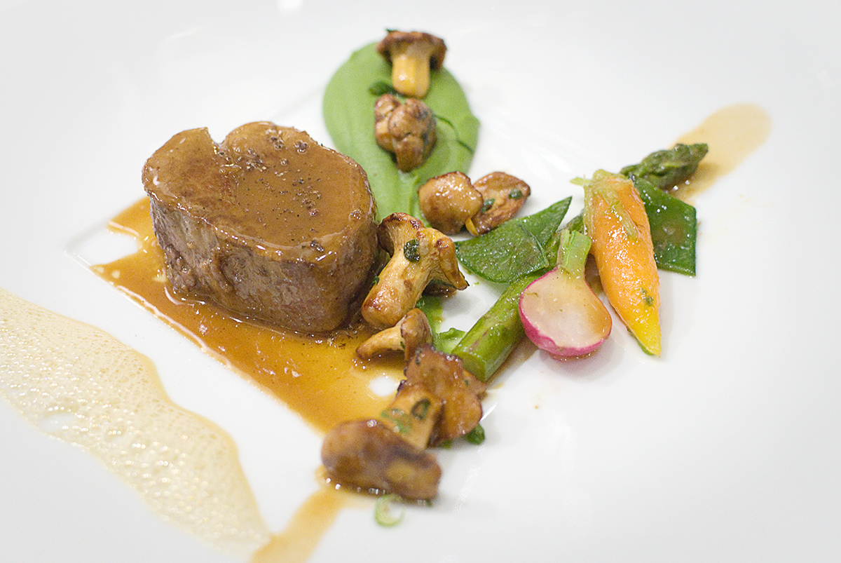 Filet de veau rôti aux girolles fraiches, émulsion lard Gascon et mousseline de petits pois