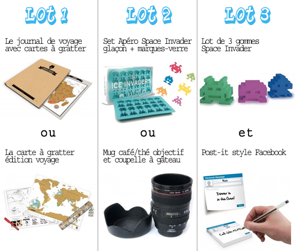J’attends que les gagnant(e)s se manifestent, depuis le formulaire de contact du Blog, en m’indiquant leur choix de cadeaux, dispo dans le lot gagné, et leur adresse postale complète.