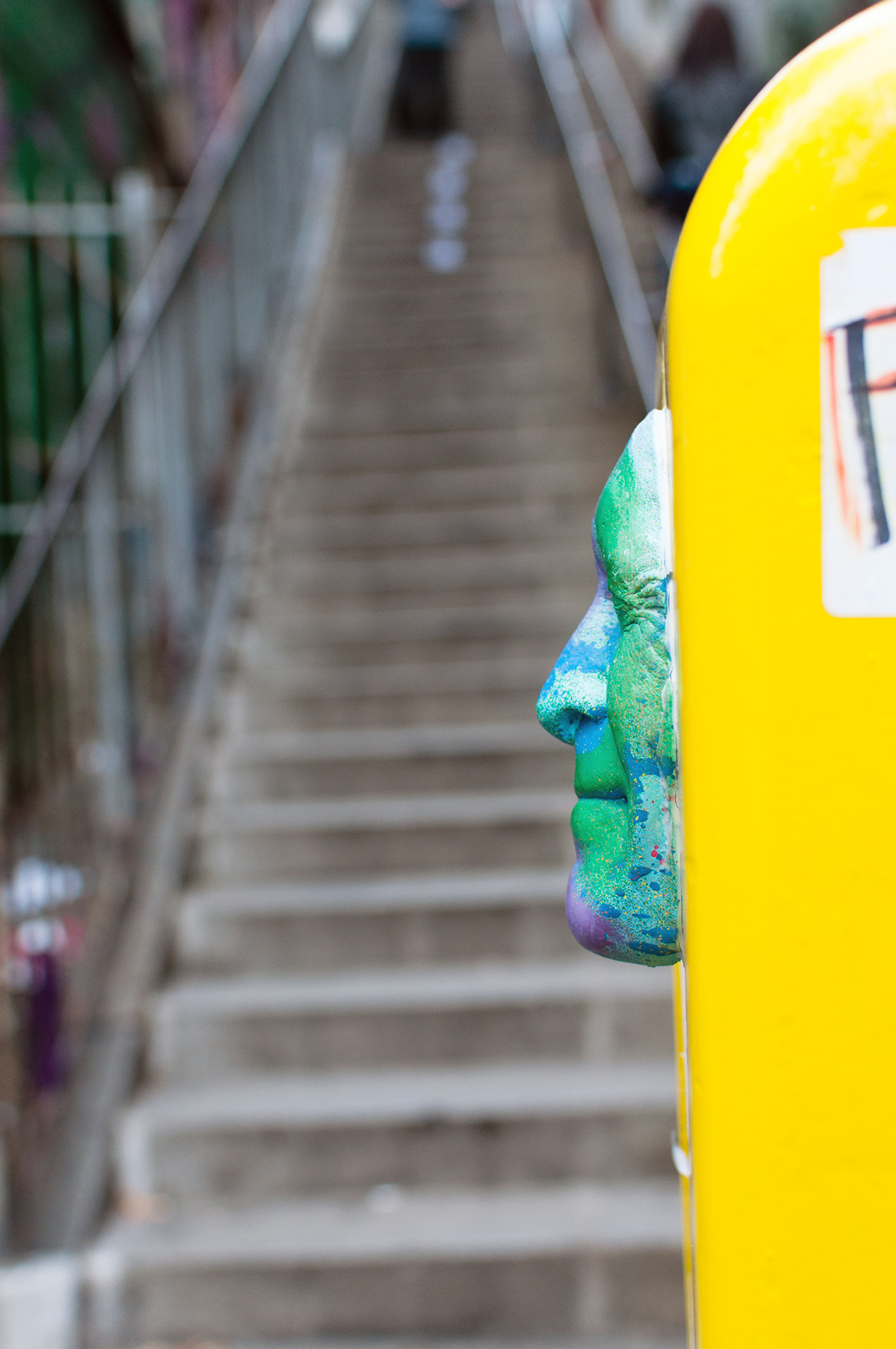 Je commence par ce quartier car c’est certainement ici que les œuvres vont et viennent le plus du fait de sa très forte fréquentation. Les artistes y sont vus et aiment bien jouer au « jeu du chat et de la souris » pour déposer leurs œuvres sur les murs. Pour y avoir habité plus de 10 ans, j’adorais me lever le matin, me promener et me dire « tiens, cette nuit Gregos est venu collé son visage ici » (par exemple). Le quartier bouge énormément en terme de présence artistique – on retrouve le plus souvent les artistes comme : Invader, Mimi the Clown, Gregos, FKDL, Ender, Monsieur Chat, Jef Aerosol, CLET (un artiste italien très présent), Pimax, … pour ne citer qu’eux.