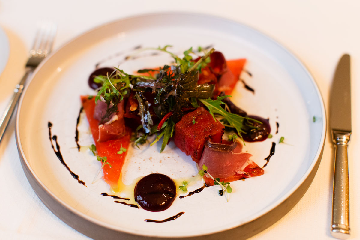 Le Céladon Warwick ParisCommençons par cette entrée : Pastèque grillée, magret de canard fumé maison et son jus de cerise