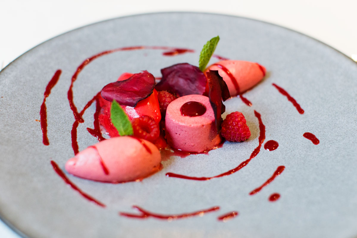Le Céladon Paris - Poulpe grilléEt finir en beauté avec en dessert : la déclinaison de framboises et betterave