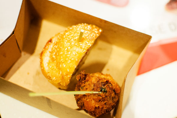 Les « Duck Balls » : séduit d’abord par le croquant de sa panure japonaise puis par le fondant de son fromage et de sa viande (de canard !). Accompagnée de sa sauce Douce (moutarde violette, cébette et miel) ou Épicée (oignons rouges, chili, citron vert)