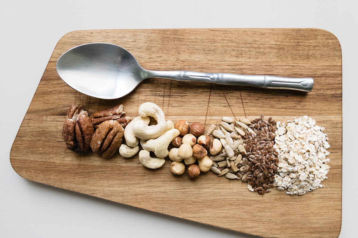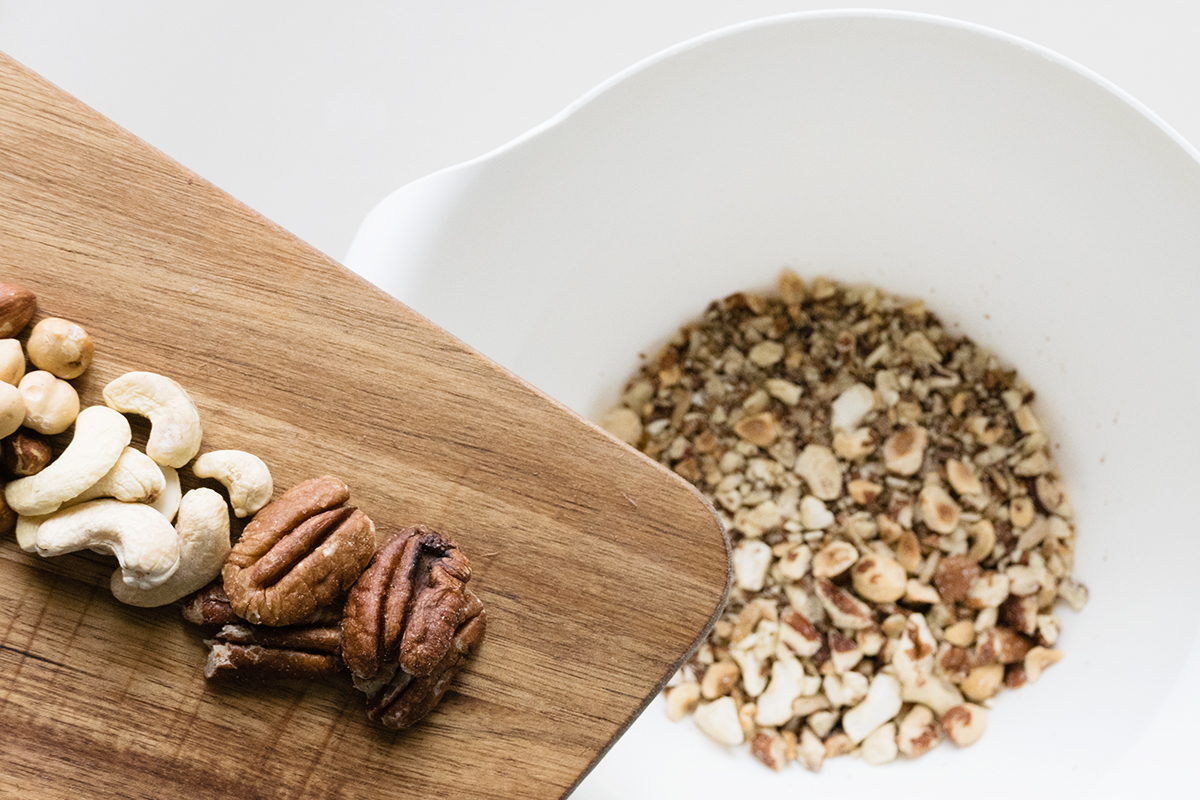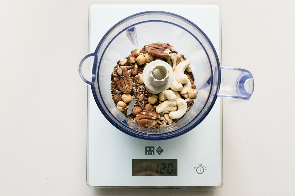 Recette Granola Sans Gluten3. Broyez légèrement les noix de pecan, noisettes et noix de cajou avec les graines de lin et tournesol