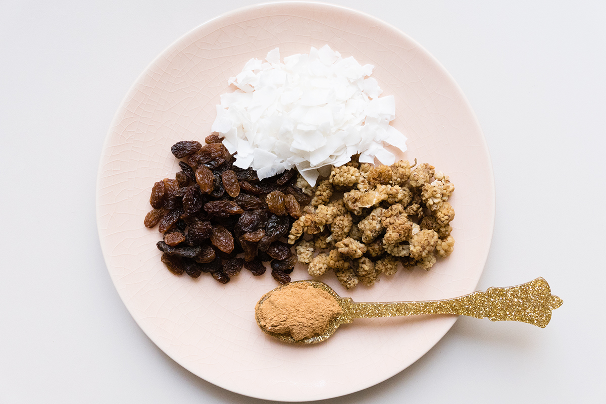 Une fois le Granola froid, ajoutez des fruits secs : raisins, cranberries, mulberries, abricot sec coupé en morceaux, bananes sèches … mais ceci surtout après cuisson !
