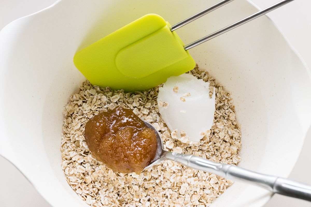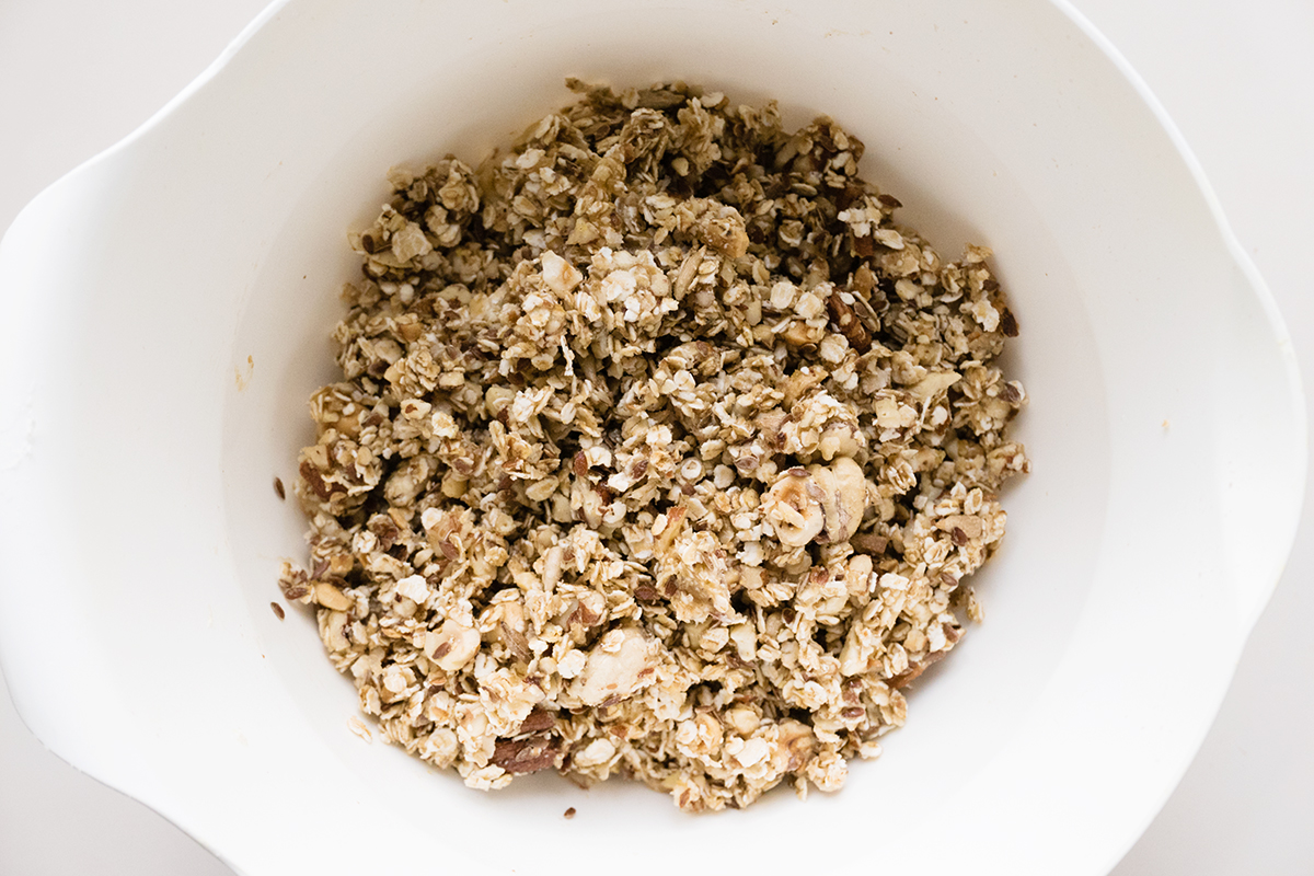 Recette Granola Sans Gluten5. Mélangez à l’aide d’une maryse jusqu’à ce que le tout soit bien imbibé (de miel et huile de coco) et mélangé
