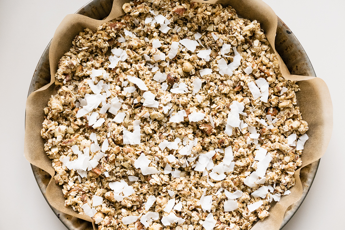 Recette Granola Sans Gluten6. Déposez une feuille de papier cuisson dans un plat à tarte ou votre plaque de four et versez-y le contenu de votre saladier. Répartissez le Granola pour avoir une couche assez fine. Je parsème souvent de chips de coco