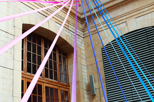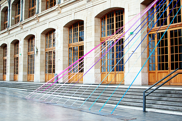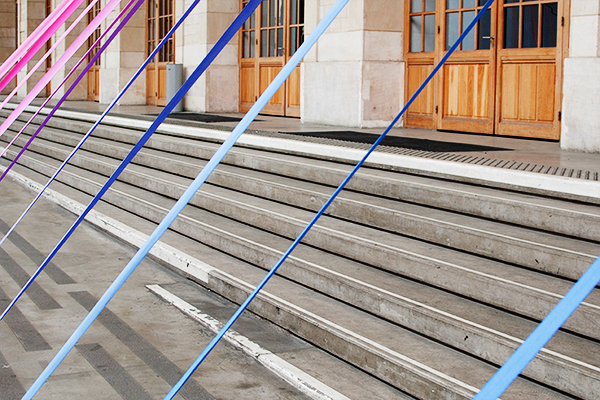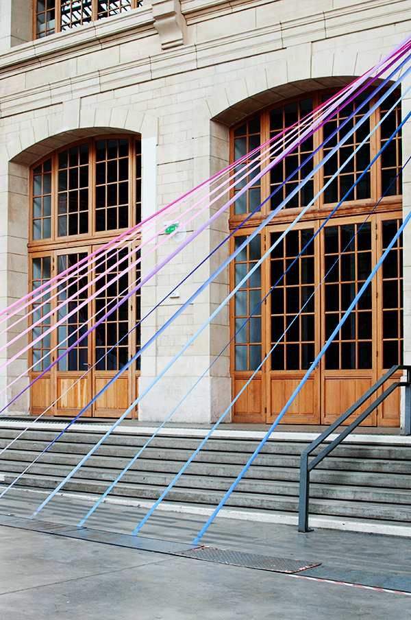 « Les interventions dans l’espace imaginent la présence d’un invisible et le révèlent en rompant un silence visuel. Elles produisent des apparitions et disparitions de lignes et de couleurs qui ouvrent une lecture, donnent une direction, proposent un mouvement »