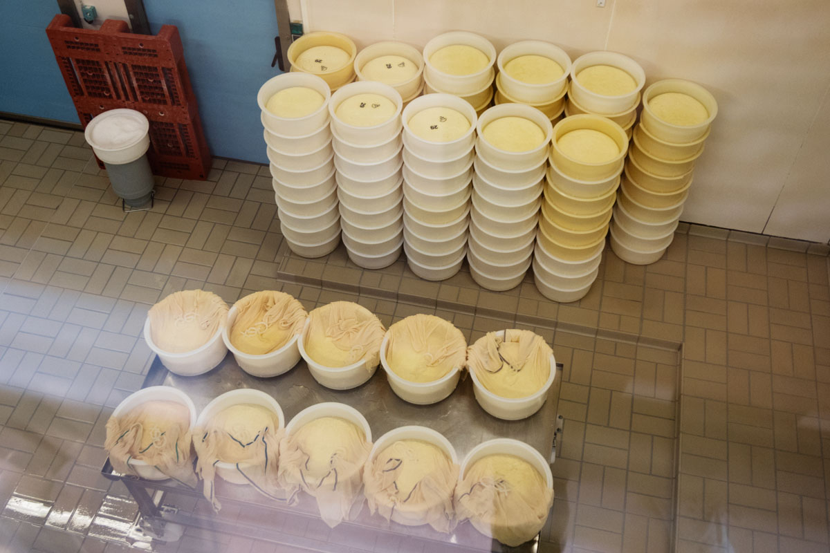 Le processus de fabrication commence dès 4h du matin, chaque jour avec la collecte du lait et sa mise en cuve avec l’ajout de ferments (penysillium pour ajouter le Bleu) et de pressure pour faire chauffer le tout à 28°C.Vient ensuite le moment de découper le caillé, suivi d’une succession de brassages alternés avec des temps de repos pendant environ 1h (ou du moins jusqu’à ce que le fromager décide que la cuve est prête à être remontée – le grain au fond de la cuve et le petit lait – ou serum – en surface).