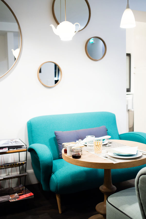La décoration m’a tout de suite séduite par ses couleurs et le choix du mobilier vintage des années 50 mélangé à du contemporain. L’hôtel dispose de 5 chambres bien réparties, d’un espace de vie commune, d’une bibliothèque et d’une cuisine. Comme à la maison !