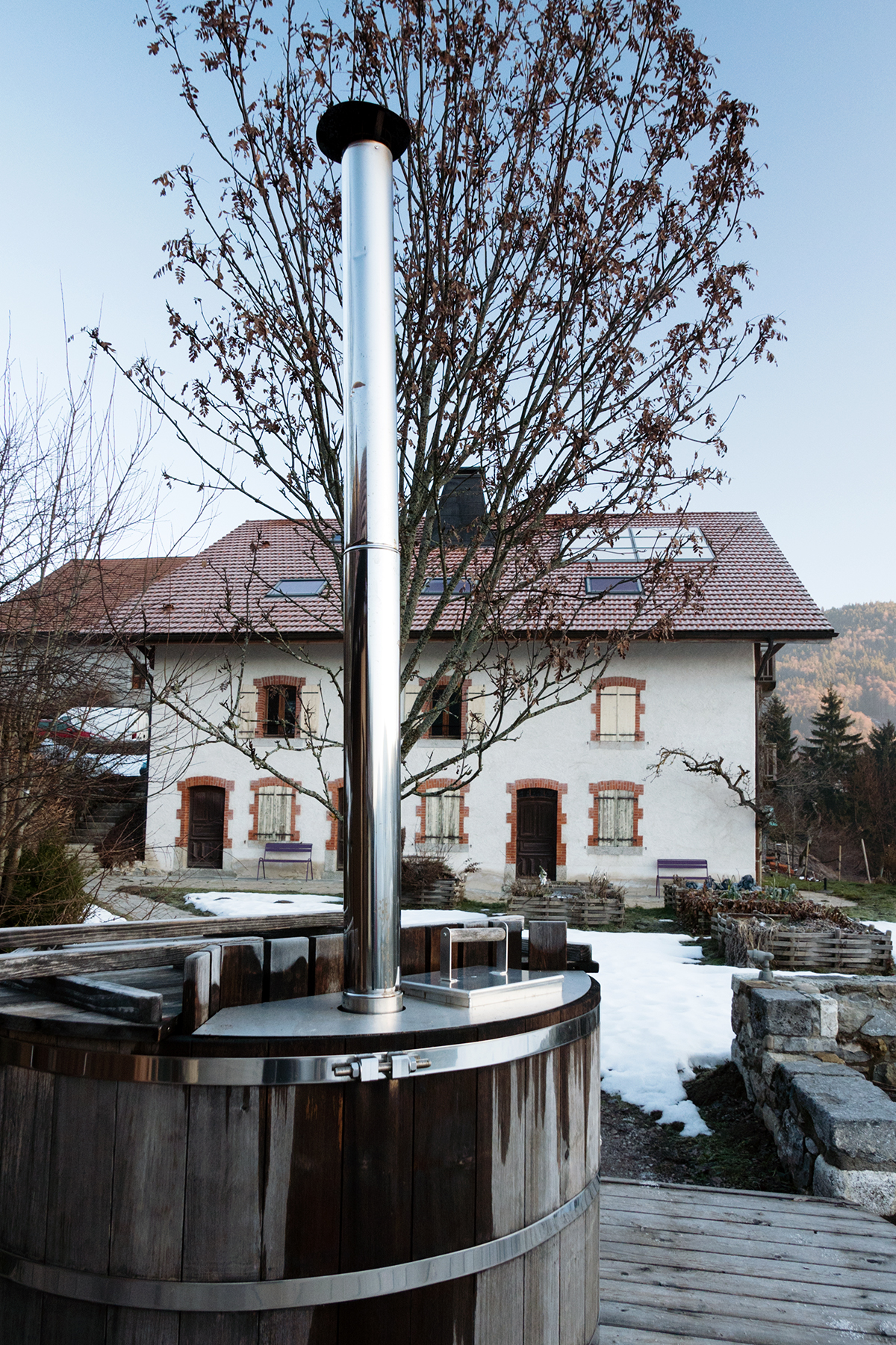 Nous sommes arrivés à la nuit tombante, donc pas vraiment eu l’occasion de voir les alentours, ni même le charme de la maison dans laquelle nous sommes entrés.