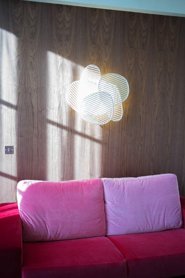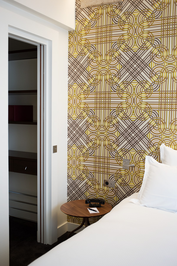 Dans le salon, qui sert également de lobby, petit mais dans l’esprit cocoon, des fauteuil club Chartwell de Conran, des luminaires Zig Zag de Jielde et un papier peint Birdbranch de Timorous Beasties qui donne la touche finale.