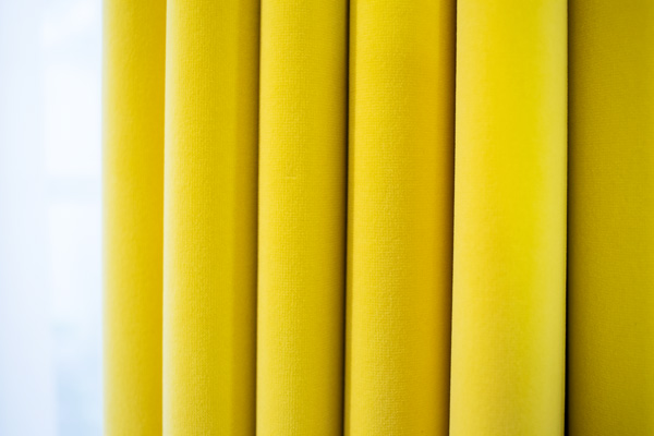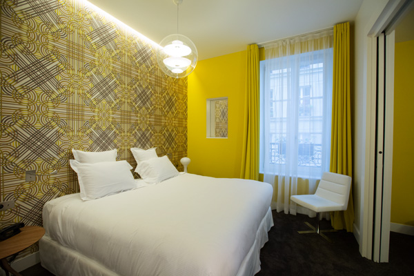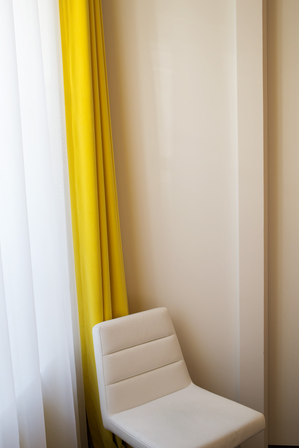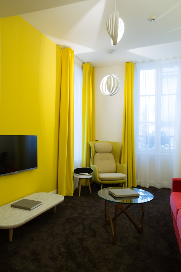 Une fois à l’intérieur, j’arrive par une alcôve d’entrée et je suis immédiatement comme hypnotisée par le jaune qui se fait star dans cette chambre – un jaune très agréable et adoucie par le velours de coton des rideaux.