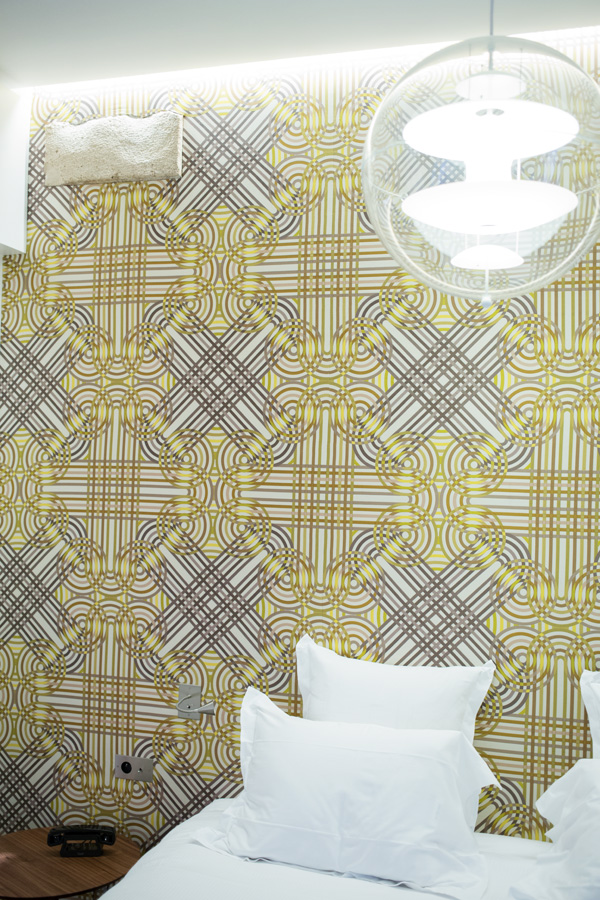 Un mur coulissant en guise de séparation et faisant également office de miroir est disposé entre le salon et la chambre. Tout de suite attirée par l’énorme ‘boule’ en suspension au-dessus du lit (VP Globe par Verner Panton) je ne remarque qu’ensuite la jolie tapisserie au style fifties tout en étant moderne en soie de la marque Hermès.