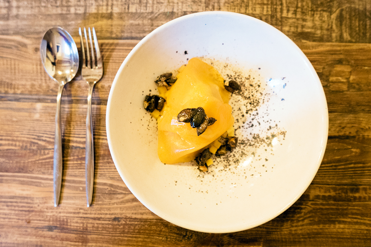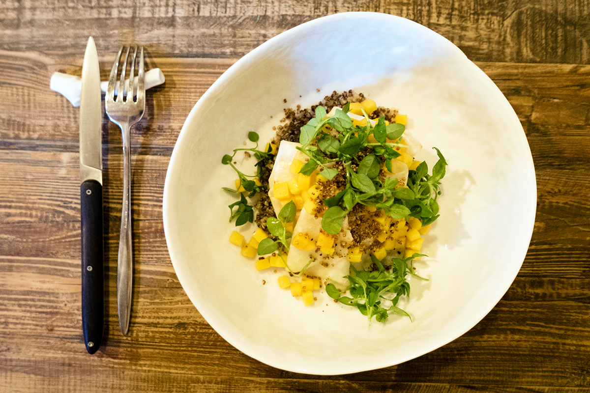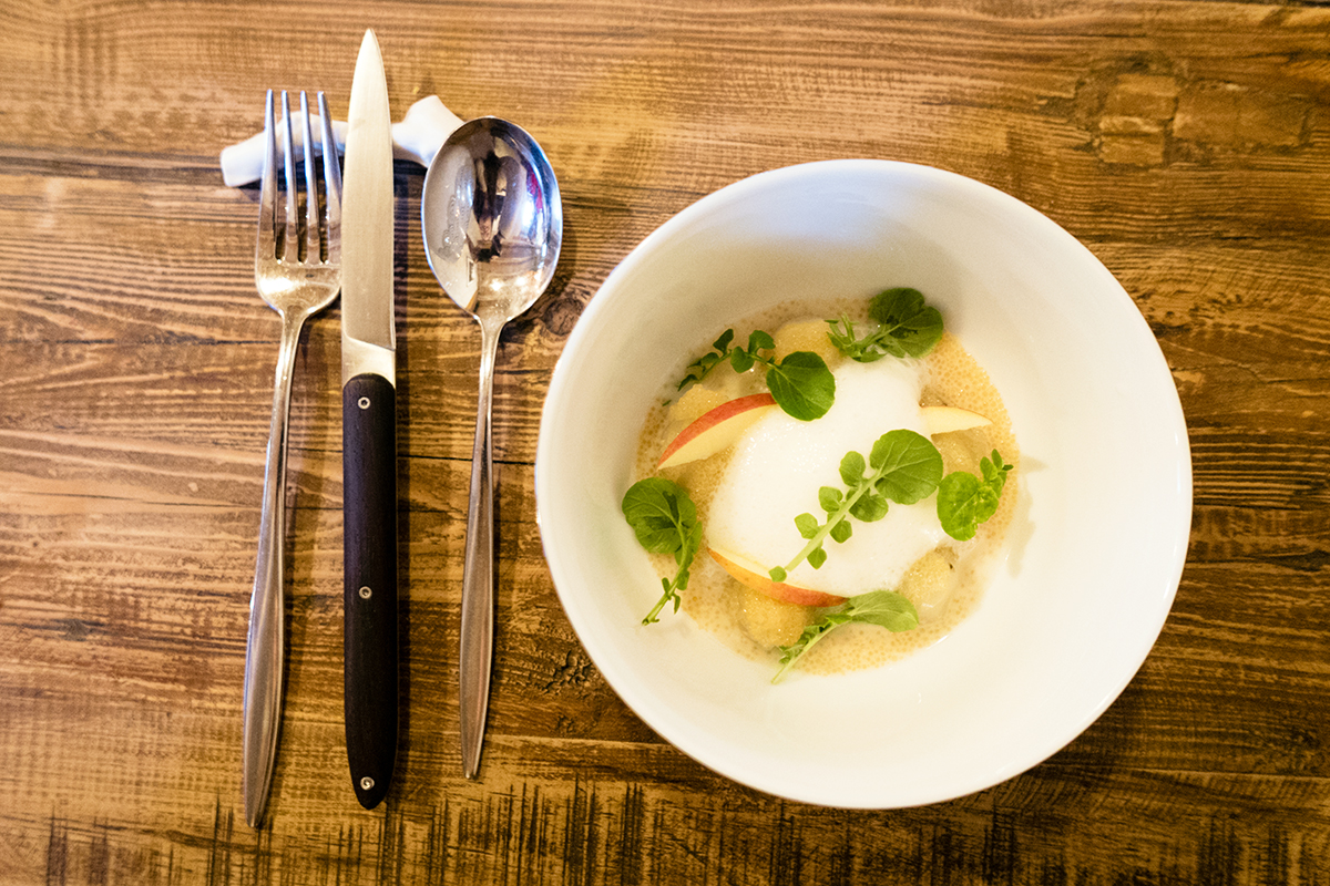 Le restaurant s’inscrit entre modernité et tradition. On sent un Chef cuisinier sensible aux beaux produits de la région avec une véritable envie d’emporter ses convives vers des goûts différents. En tout cas je me suis sentie comme dans un voyage culinaire, avec toujours une surprise dans mon assiette : des associations de goûts parfaites de l’entrée au – plus surprenant – dessert.