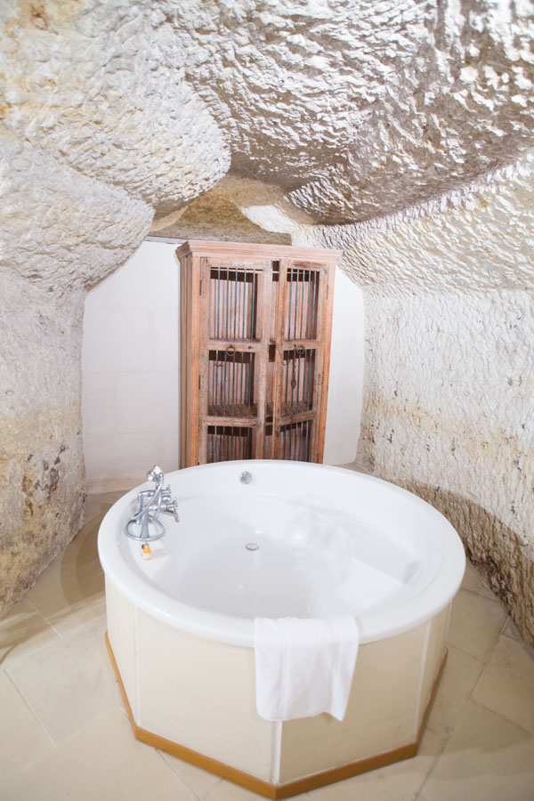 A l’extérieur du Château se trouve alors la Suite Troglodyte de l’hôtel qui propose une expérience inédite dans une chambre très spacieuse et très agréable avec son salon, son lit à baldaquin et sa baignoire ronde appelant à un vrai moment cocoon.