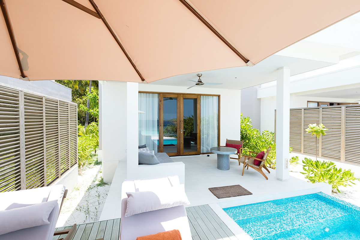 Place à la découverte de notre Beach Villa avec piscine. Après les 2 Water Villas des îles précédentes, nous étions ravis d’avoir les pieds dans le sable ! Il nous tardait de découvrir notre maison…