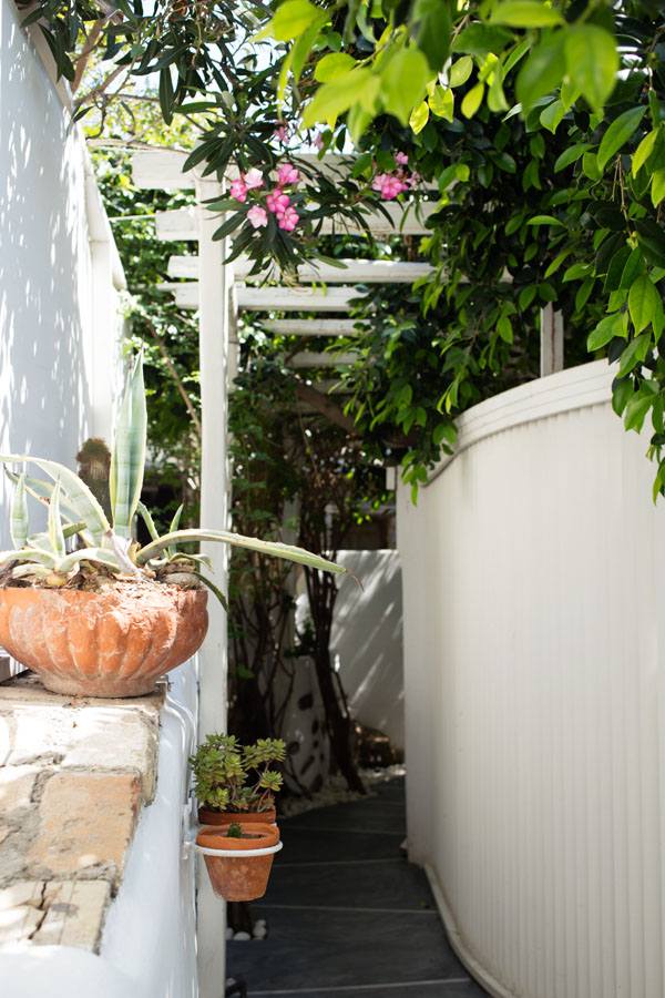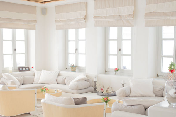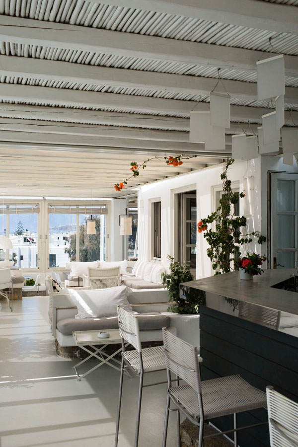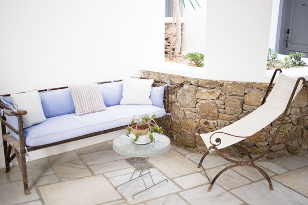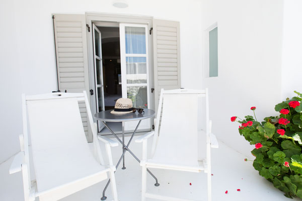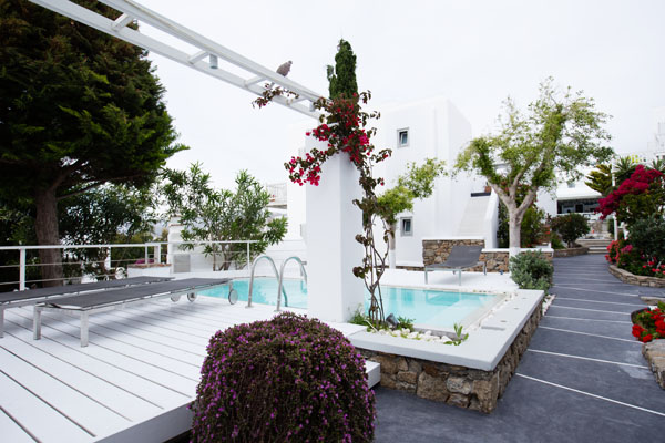 L’hôtel est construit dans le style typique des cyclades, à savoir murs blanchis à la chaux et jardin fleuri de géraniums et bougainvilliers.