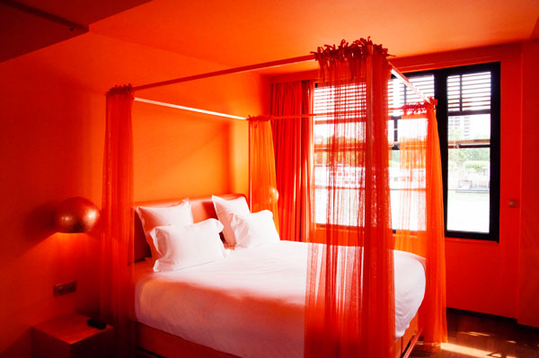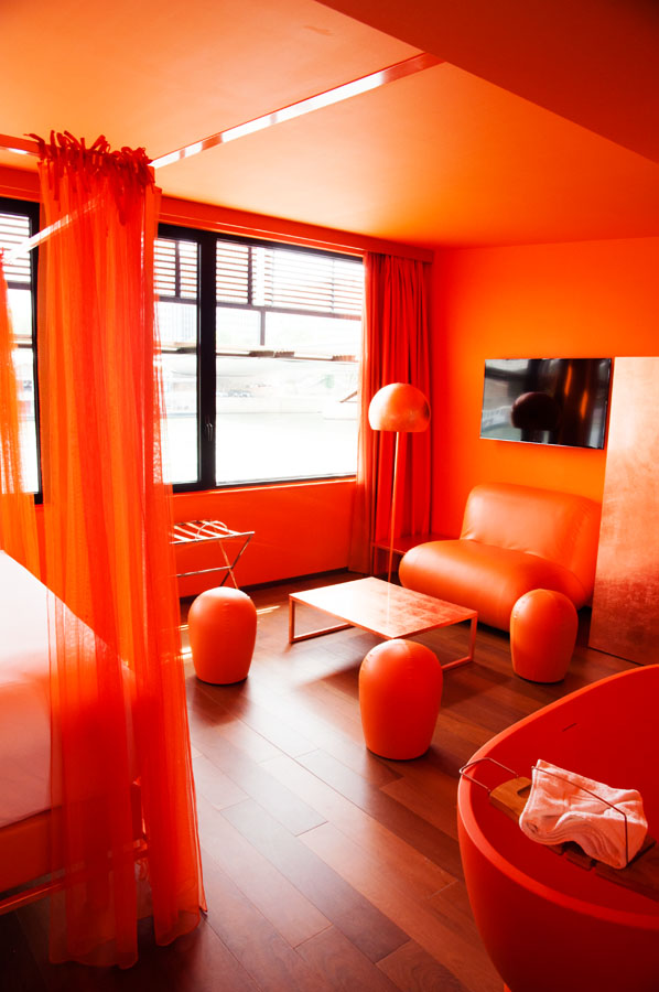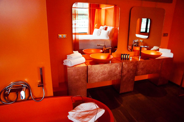 Visite ici d’une des Suites de l’hôtel – la SUNSET à dominante orangée :