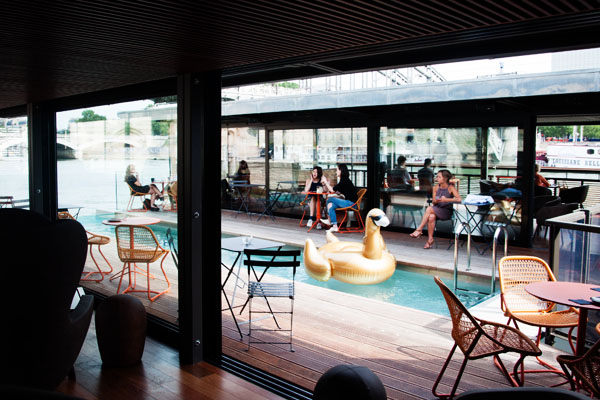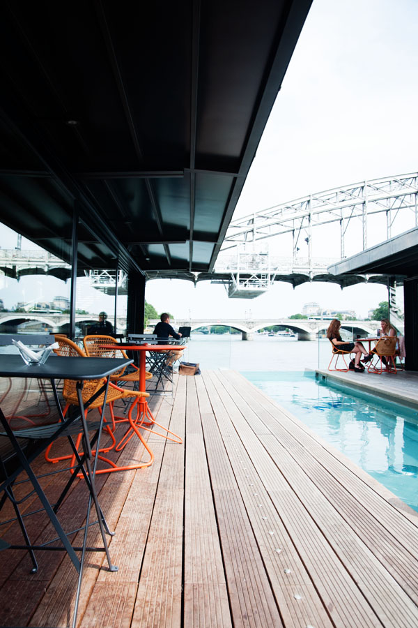 L’hôtel se compse en réalité de 2 fonds de péniches, rassemblés pour créer comme un « catamaran » sur lequel a été monté les différents éléments : 58 chambres et 4 Suites (bien sûr), le lobby d’accueil, 2 salles de petit déjeûner, la terrasse, une marina et… la piscine.