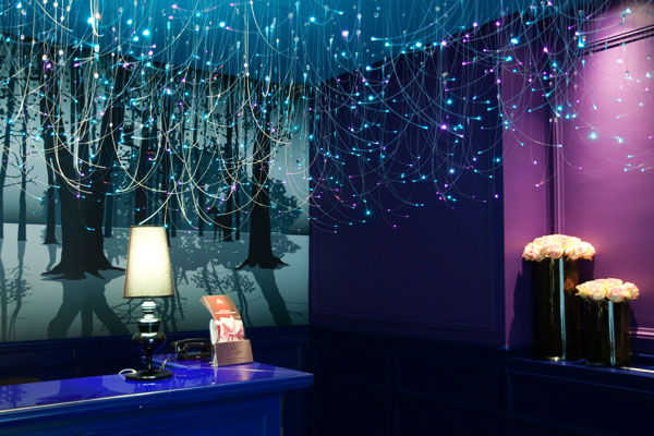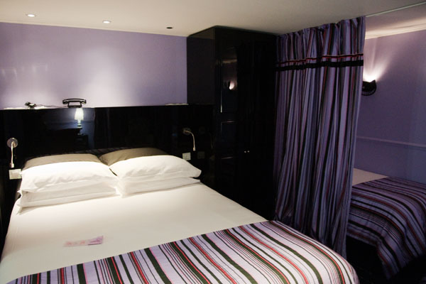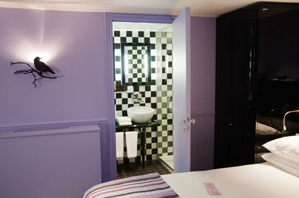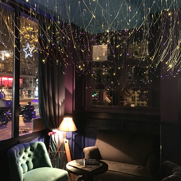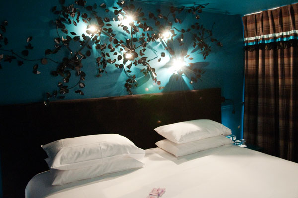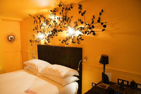 Stella Cadente, la décoratrice et Vincent Bastie l’architecte, ont imaginé pour les 38 chambres de ce charmant Boutique-Hôtel vieux de près de 100 ans, un monde à la fois fantastique, chic, poétique et contemporain. Tissus de luxe et fibres optiques dans les lampes ‘méduses’, feuilles d’or aux murs et station iPod dans les chambres donne un confort moderne qui plaira à tous. Tant aux personnes séjournant seule ou en couple qu’aux familles, puisque des chambres triples voir quadruples sont disponibles. Si rare à Paris, avouons-le ! Mon petit coup de coeur revient tout de même à la chambre single – la Luxure par exemple – qui dispose d’un grand lit (tout de même) et d’une baignoire ouverte sur la chambre qui donne directement sur la Tour Eiffel par la fenêtre du toit (6ème étage de l’hôtel). Quoi de plus chic ?