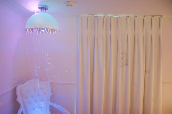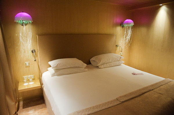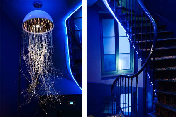 Puis la « méduse » aux filaments lumineux qui changent instantanément de couleurs… Finalement, en visitant quelques chambres de l’hôtel (situées au premier étage), je me rends vite compte que les lampes méduses, sont le fil conducteur de l’hôtel et c’est un très bon choix, car c’est intriguant et zen à la fois…