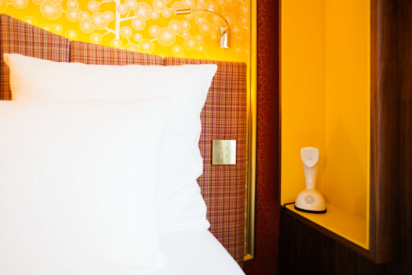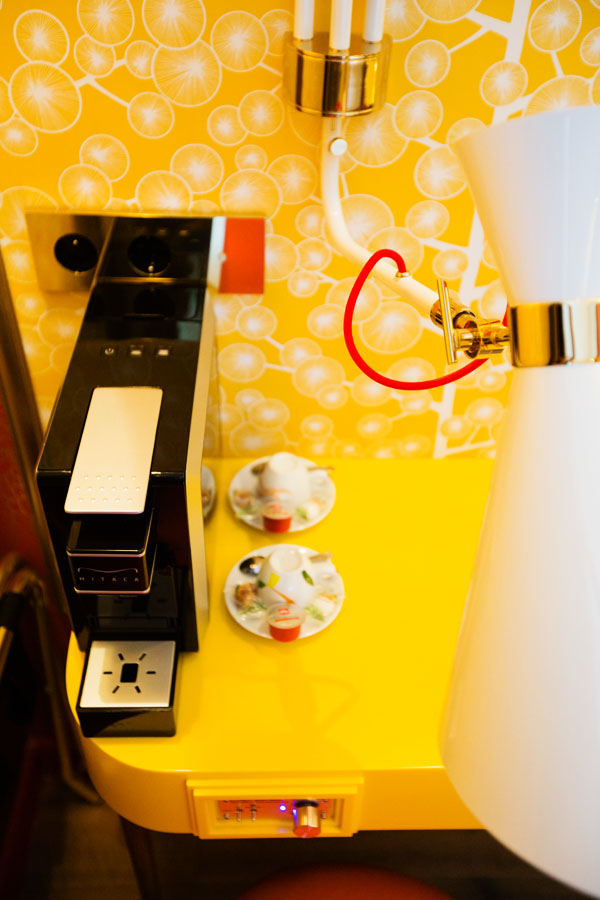 Une fois installée dans un fauteuil de l’entrée, l’hôtesse nous explique le fonctionnement de l’hôtel, puis nous sommes accompagnés dans notre chambre où on a droit à une visite guidée qui ne laisse aucun détail de côté… jusqu’au fonctionnement des enceintes bluetooth de la chambre !