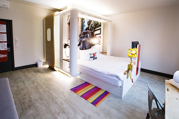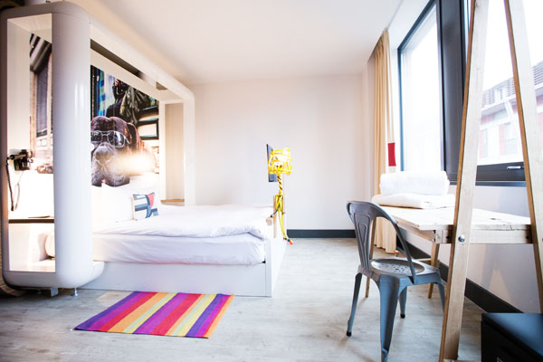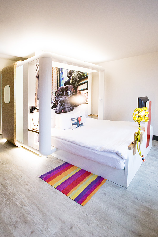 Les 171 chambres ont été conçues par Marc Mostert, designer néerlandais, façon Rubik’s Cube monochrome. Les grandes impressions photographiques sur le mur amène la touche artistique.