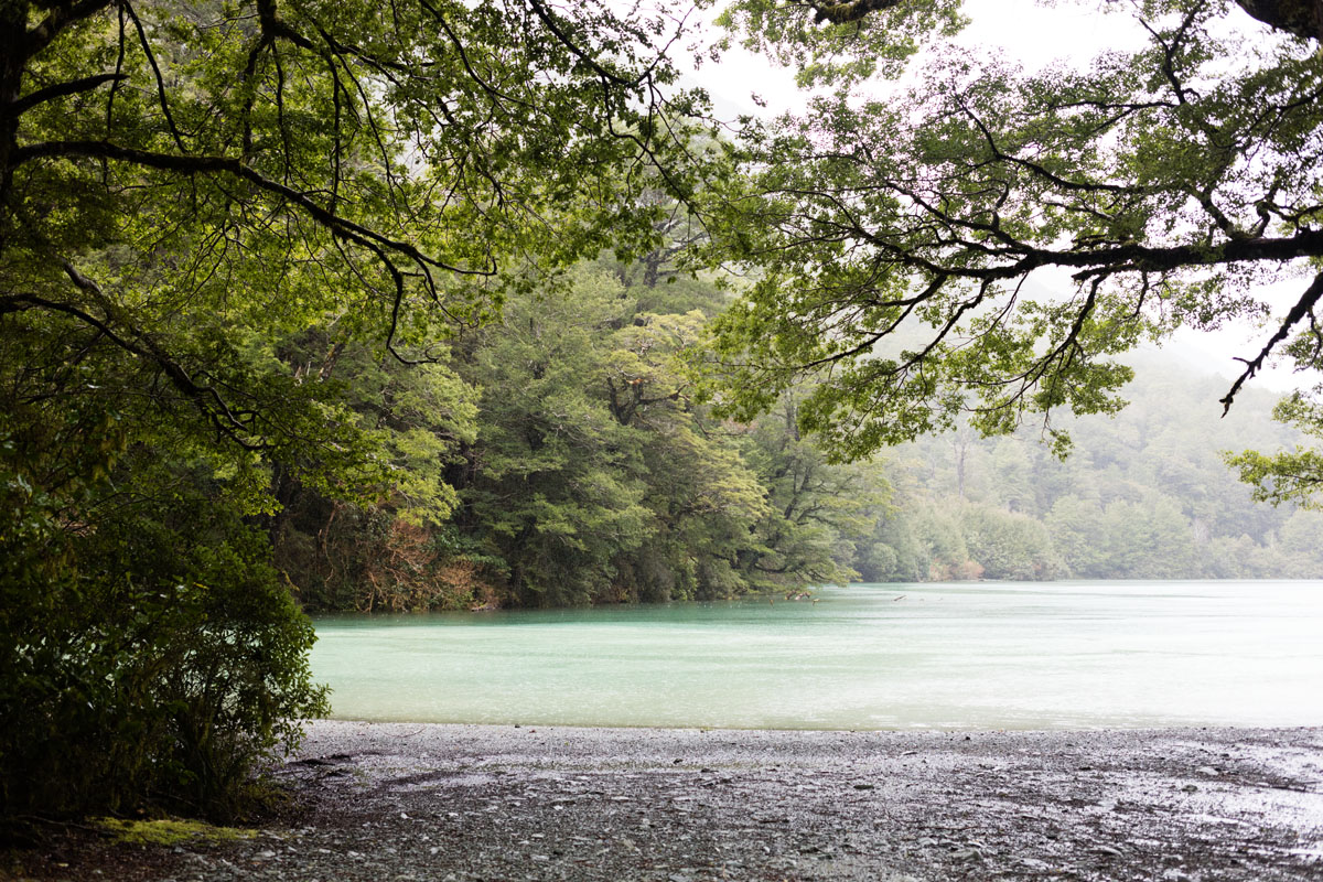 > Lake Gunn (accès au travers d’une forêt de hêtres qui mène jusqu’à un lac de couleur bleu/vert glacial)