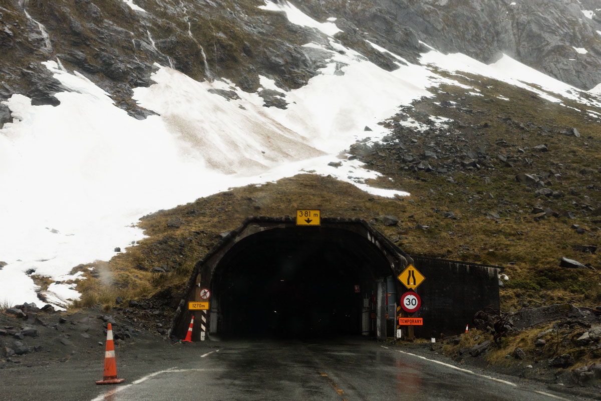 > Homer Tunnel (fameux tunnel à une voie unique, construit en 1953 sans évolution depuis, qui monte vers Milford sur 1,2km à une altitude de 945 mètres)