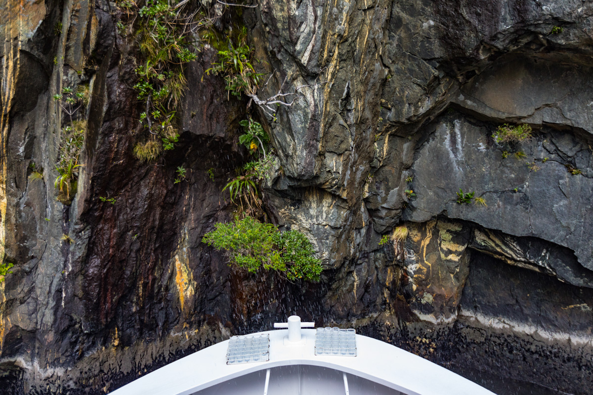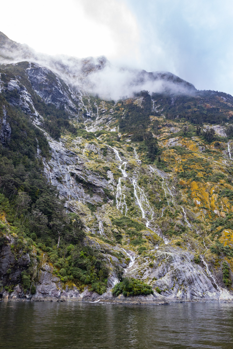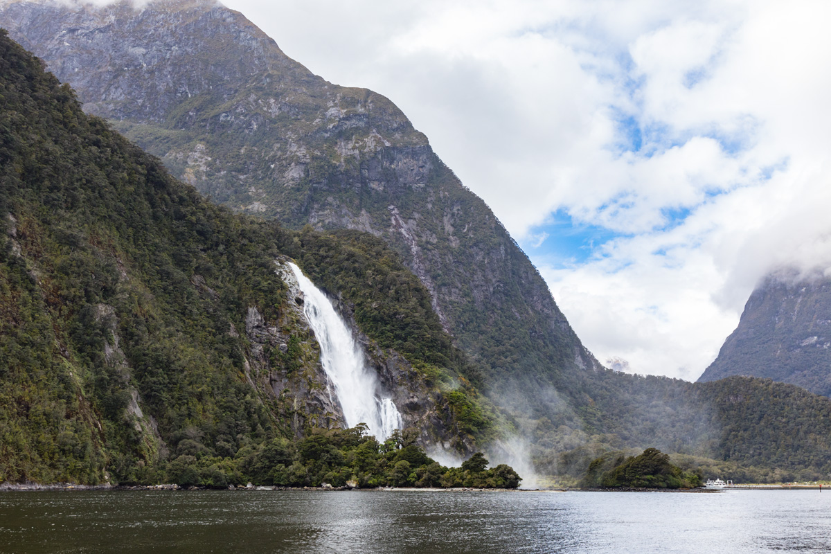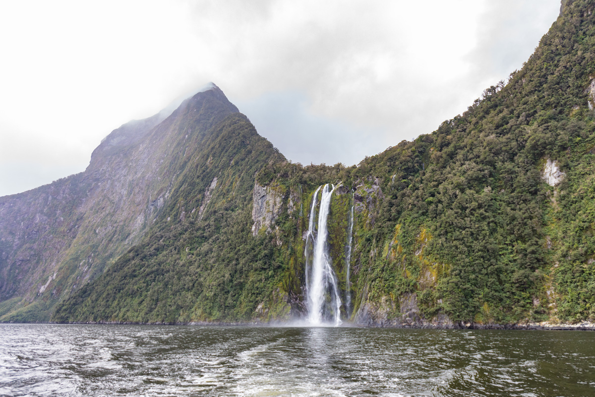 Il est temps de rejoindre le port… et de capturer les derniers instants que nous offre Milford Sound avec sa fameuse cascade Bowen, que l’on observe dès l’arrivée sur Milford :