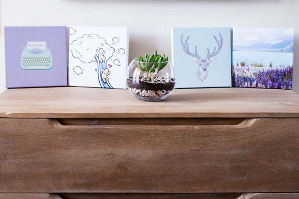 J’entends ici ‘petits cadres’ pour petit appartement. J’ai déjà pas mal d’oeuvres accrochées sur mes murs, notamment street art, et je n’ai plus trop de dispo… si ce n’est sur mes meubles. C’est pour cela que je souhaitais des petits formats, à mixer, ou échanger selon l’humeur. Le site propose bien d’imprimer aussi de très grands formats, allant de 20 x 20 cm jusqu’à 90 x 120 cm.