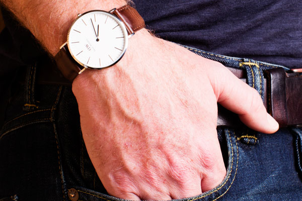 Je n’étais pas forcément attiré par les montres, surtout depuis que j’ai cassé la mienne, il y a des années de cela ! D’ailleurs, si j’essaie de compter, cela remonte au temps où je vivais en Nouvelle-Zélande, donc il y a bien 15 ans… Vous voyez, c’est pas tout jeune. Mais depuis que Sandrine portait cette montre DW à son poignet, j’avoue que je lorgnais dessus en secret… Alors j’ai finalement sauté le pas et je me suis laissé tenter par un modèle à mon tour. J’ai longtemps hésité entre un bracelet plutôt ‘casual’ ou un bracelet en cuir et je me suis finalement décidé pour la version cuir, que je mettrais plus facilement et plus longtemps. Et puis je pourrais toujours m’offrir le bracelet NATO plus tard pour la porter en été par exemple. Puisque les montres sont personnalisables.