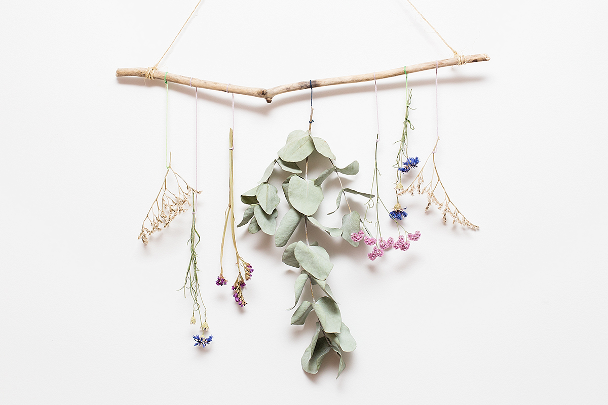 Choisissez vos fleurs et les fils de différentes couleurs pour les accrocher tout à tour au bout de bois. Laisser parler votre imagination et cette suspension sera forcément réussie !