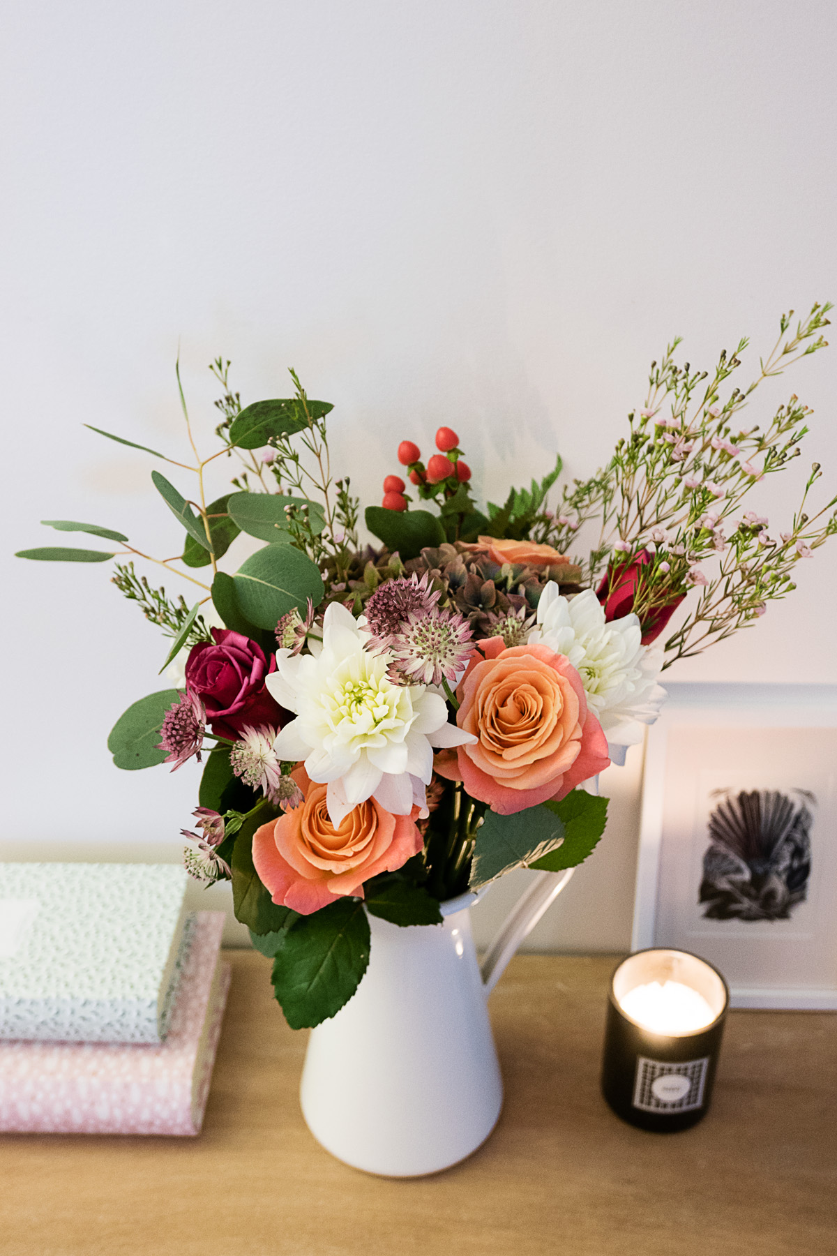 Pour cette présentation, j’ai eu la chance d’assister à un cours de création florable pour notamment réaliser un bouquet en respectant la fameuse vrille – la manière de composer son bouquet en ajoutant les fleurs une à une en créant une vrille (les fleurs tournent les unes autour des autres, dit autrement). J’ai choisi quelques fleurs, et joué avec les hauteurs de chacune pour obtenir ce joli bouquet pour mon meuble de salon. J’ai pu le transporter grâce à la super boîte de livraison pour vous montrer que même livré au bureau, vous serez fière d’afficher votre colis 🙂