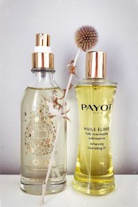 Et côté produit huilé, j’alterne entre l’Huile Elixir de Payot et celle de l’Or Bio de Melvita (les deux m’ont été offerte et les senteurs sont divines et gourmandes. Et les flacons durent… toujours (à vie) !