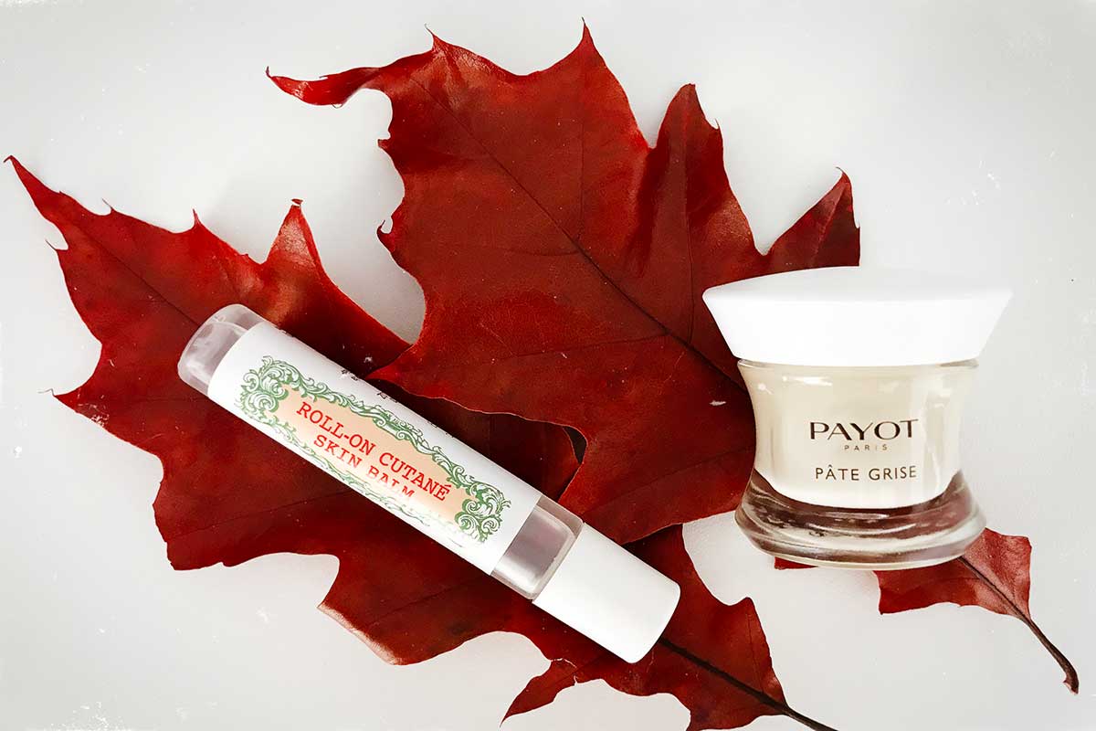 Il y a toujours un jour dans la semaine où un petit bouton va apparaître, avec ou sans raison ?! Ah mais il faut agir vite pour éviter la cata… Pour cela, j’utilise depuis des années la pâte grise de Payot qui assèche rapido le bouton en question et laisse la peau nette ! L’huile essentielle de Tea Tree (appliquée en une goutte pure sur le bouton) est également top. Et découvert en même temps que le gant H2O at Home, ils ont créé un stick purifiant à base d’huile essentielle de lavande fine, romarin, citron, sauge, immortelle, … (ce stick est en fait utile pour d’autres petits bobos de type : égratignure, piqûre d’insecte, … donc à avoir toujours sur soi).